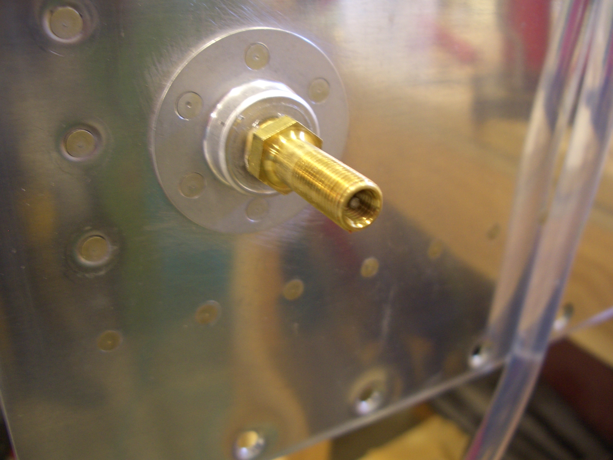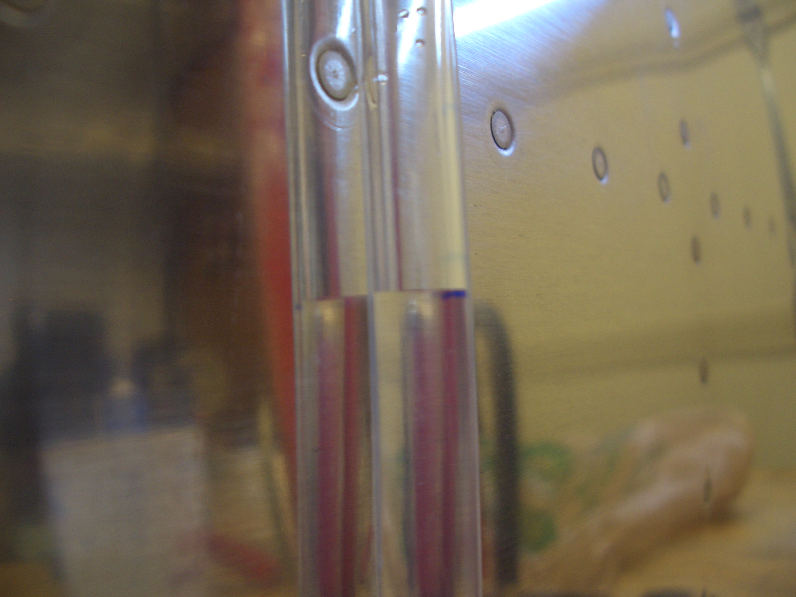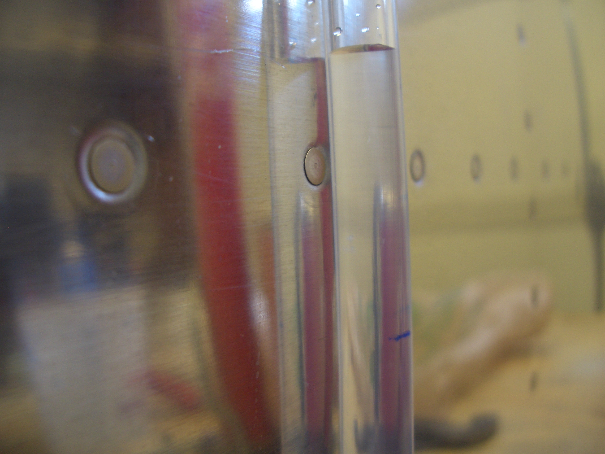 After making sure everything was torqued down and sealed properly, I put in some water in the tube and pumped the tank up to just under 1 psi. 1 psi is about 27″ of water, so I pumped it up to about 24″. Of course, as you pump air in such that the water rises in one part of the tube, it falls in the other part, so you only need to get a rise of about 12″ to create a 24″ water column. Here you can see that I’ve made a mark on the tube right at the level of the water.