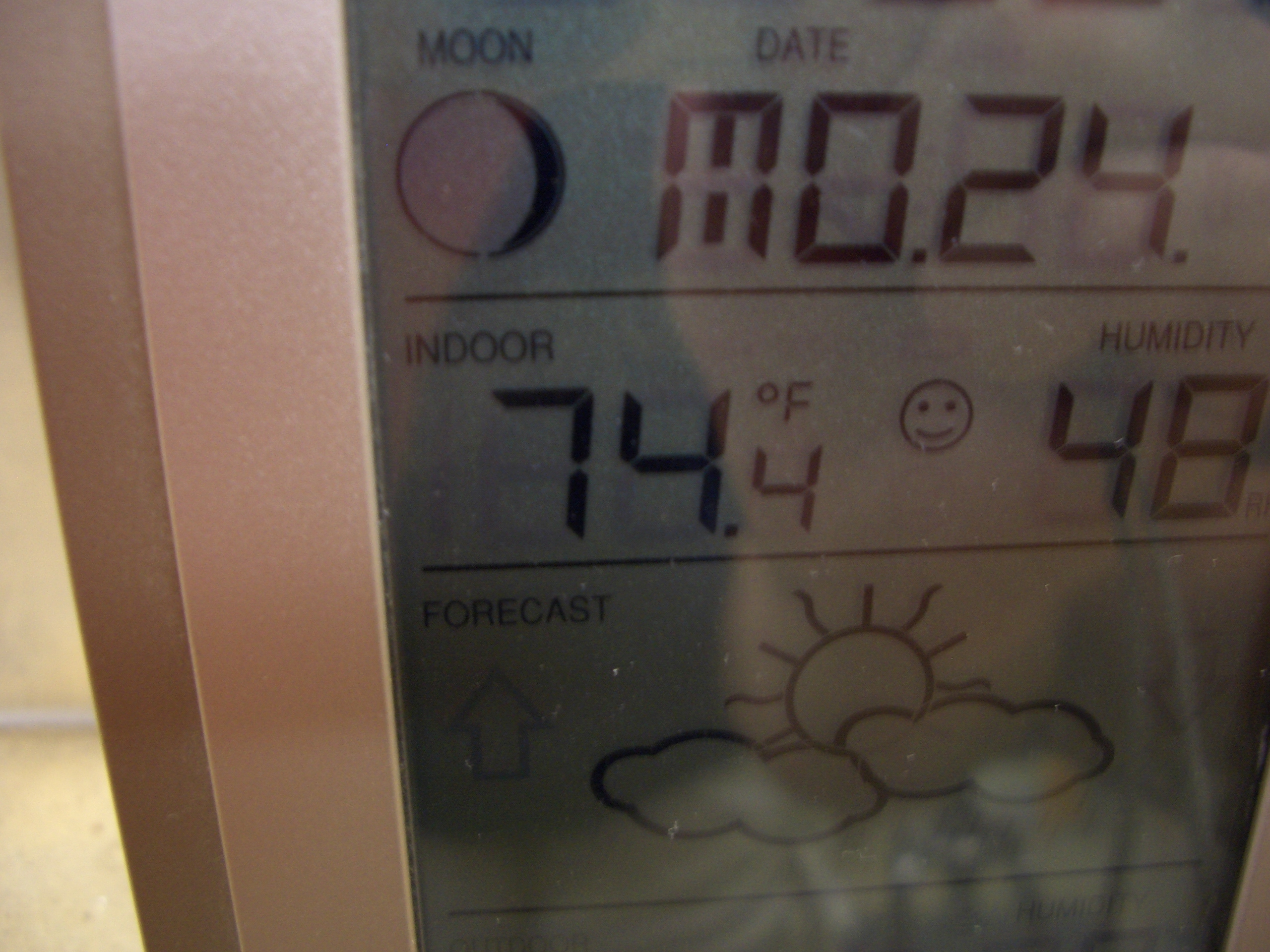 An 8.24º temperature drop from the starting temperature of 82.9º would be 74.66º. Given that a final temperature of 74.4º (shown below) would actually have made the water fall even further, I think we can safely conclude that the tank is leak free! I didn’t actually expect it to even be this close since the temperature inside the tank wouldn’t precisely track the temperature outside the tank if it were changing very rapidly.