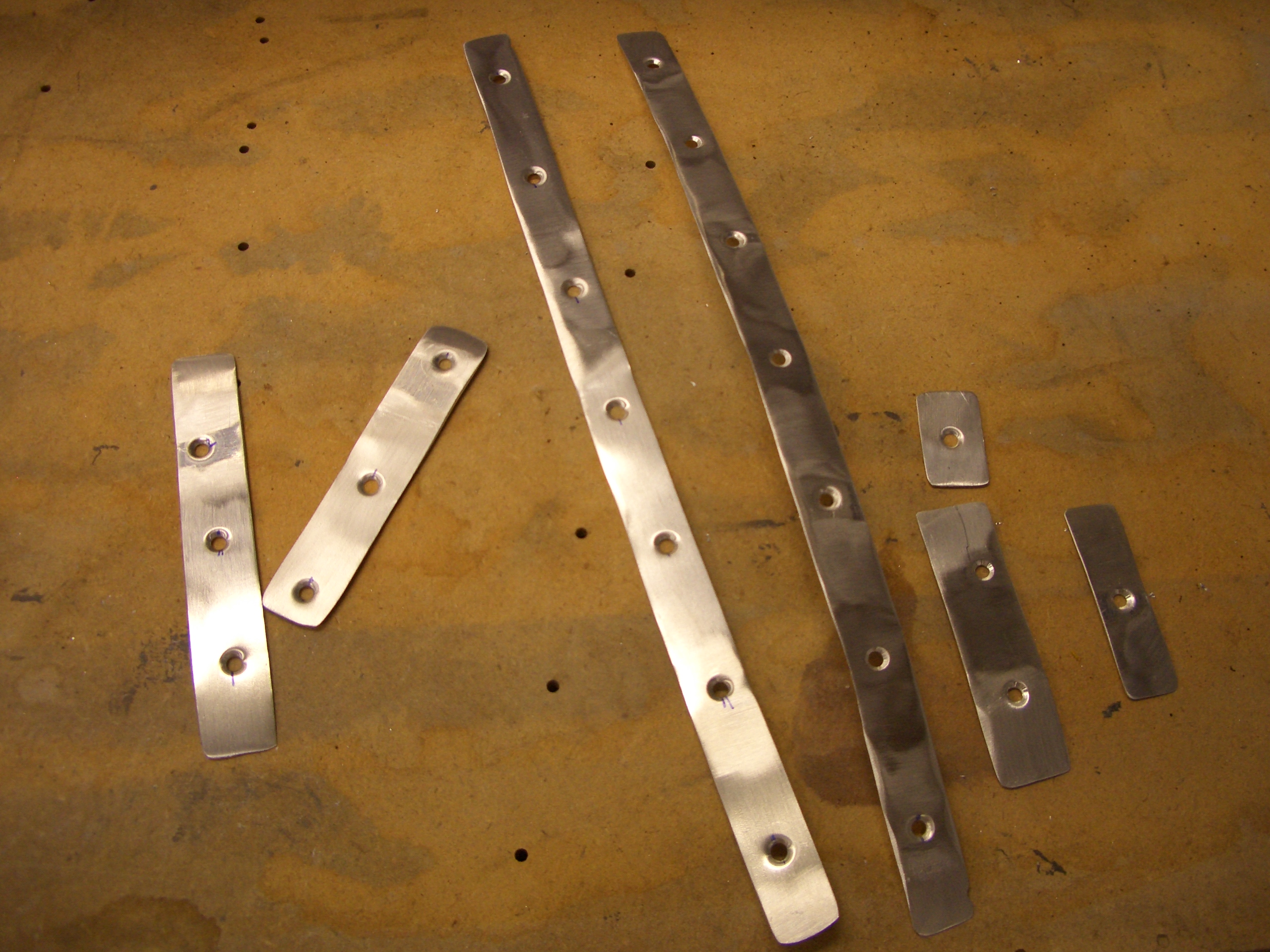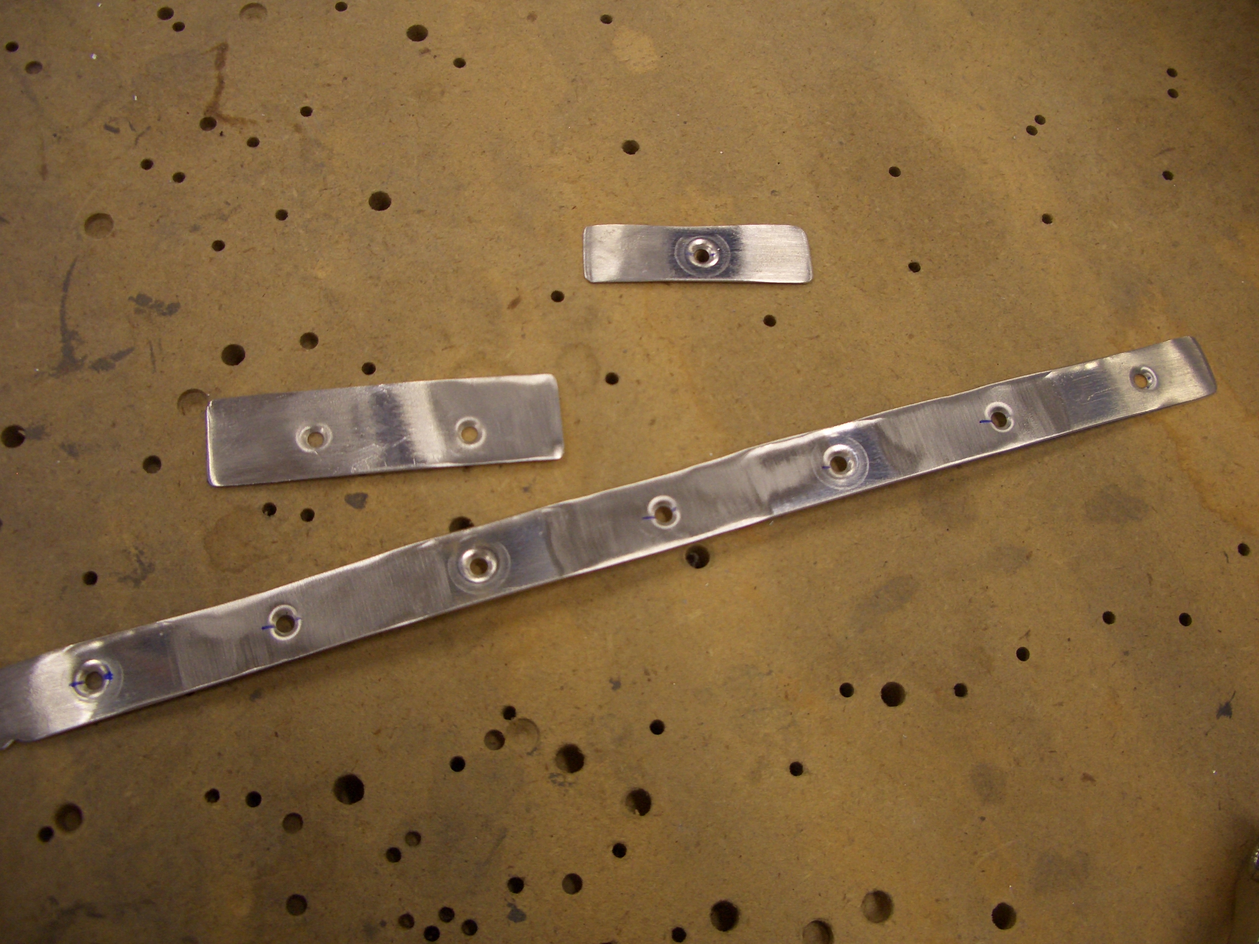 I took some measurements along the joint to see how much shimming needed to be done and then drilled out all of the rivets on the inboard rib of the outboard leading edge section (the one containing the tank splice plate). Next, I fabricated a few shims shown below for one side of one of the joints. If you click the picture to zoom in, you can see that parts of the shims have been run against the scotchbrite wheel to vary the thickness along the shim.