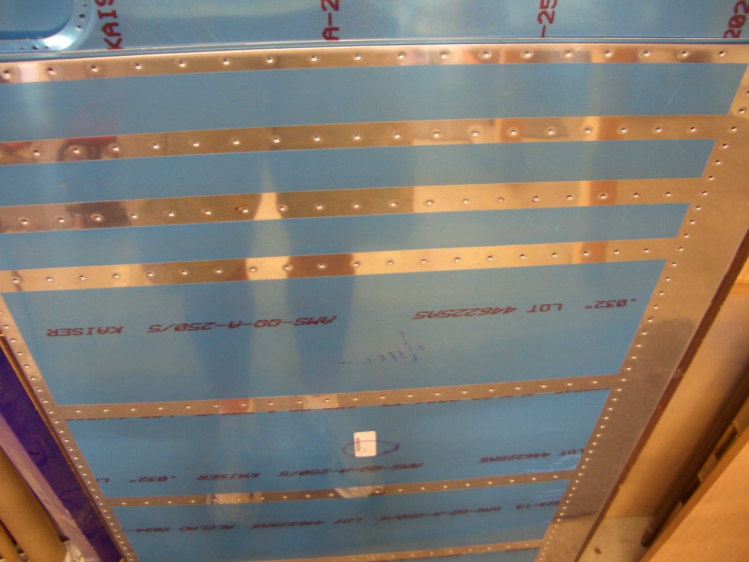 Here you can see one of the shims in place on the inside of the outboard leading edge skin. These still need some fine tuning and will need to be primed before they’re installed. These shims are only for the bottom side of the right wing, so there are quite a few more shims to be fabricated before I can rivet this all back together and install the leading edges on the wings.