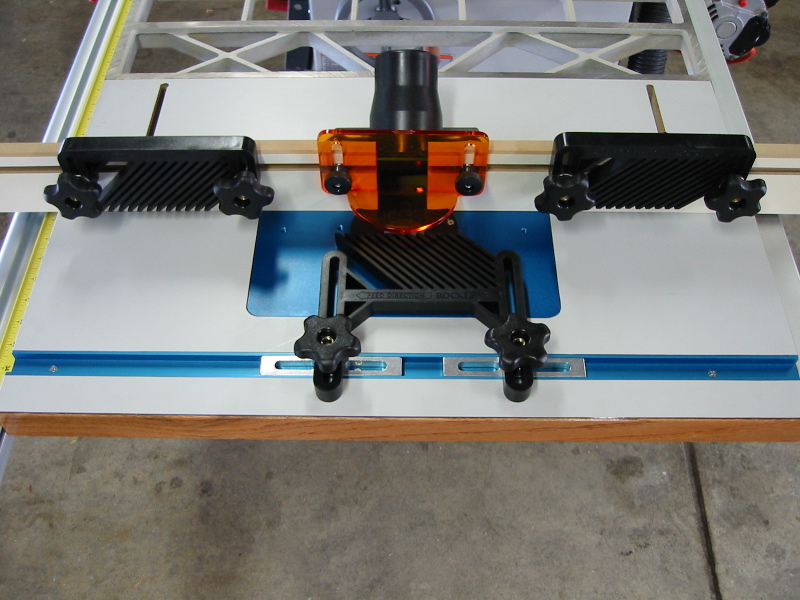 Here's a closeup of the router table and accessories (fence, router mounting plate, fence and table featherboards, dust pickup, bit guard, miter track, etc.). The router is mounted to a 1/4" aluminum plate. All of the accessories came from Rockler. |