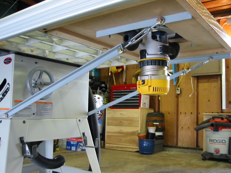 Here you can see the the custom built adjustable steel supports. I'm using turnbuckles to provide some adjustability in case the router table is ever out of alignment with the table saw table. You can also see two of the router plate adjusting screws near the corners of the hole that the router is passing through. These screws allow me to adjust the plate to be perfectly level with the table. |